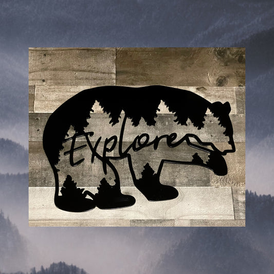 Bear with explore center Text Backdrop, Metal wall Art, Wildlife